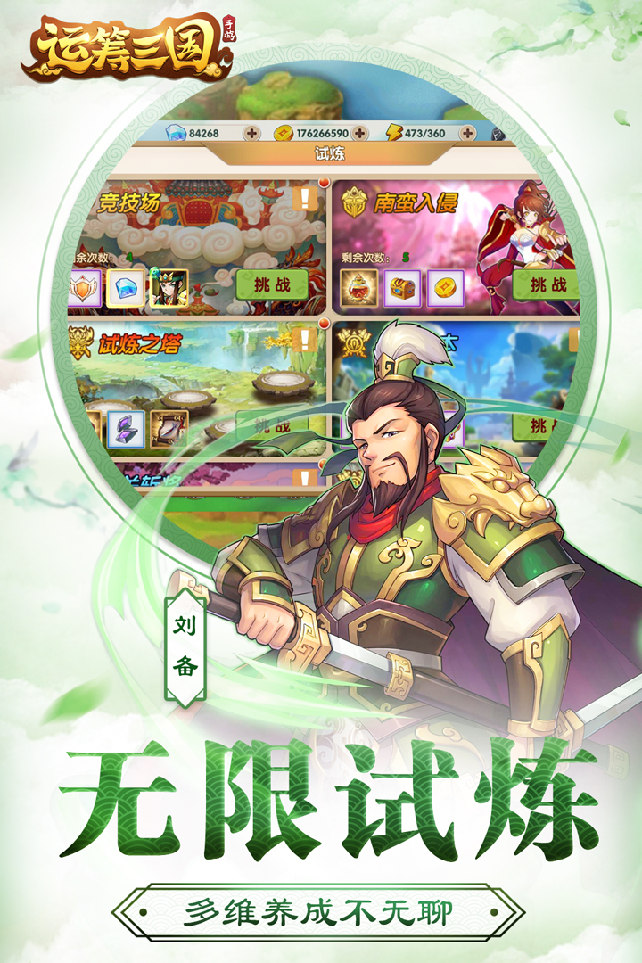 天下大势,合久必分,梦回三国之时,多少风流人物,你又是否想过自己成就一番宏图霸业?这一次《运筹三国》为你还原乱世之景,这里有独特的九宫格战法让你施展谋略,刘关张等多名英雄武将随你征战沙场。符文洗练、英雄专属装备、超炫合体技等多维度培养方式让你手下的武将快速成长!收集家园材料开国建城,还有宠物上阵助您实力超群;多重跨服争霸玩法,多种社交情缘玩法,与跨服对手的一较高下,开拓您专属的霸主之路!