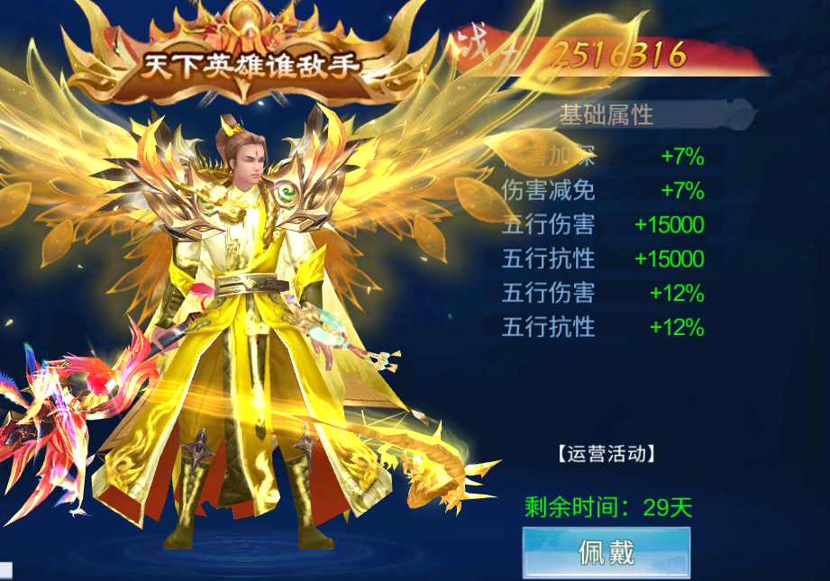 (伤害加深+7% 伤害减免+7% 五行伤害+15000 五行抗性+15000 五行伤害+12% 五行抗性+12%)