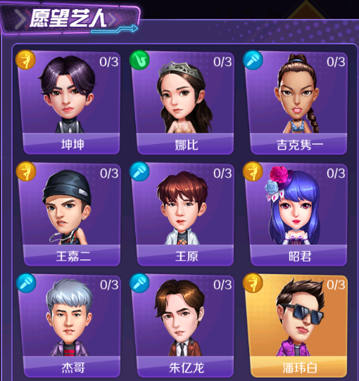 名人挑战成功后,就会解锁对应名人,在进行游戏的时候,就需要选择你选择你希望得到的艺人(后面称“愿望艺人”),点击选择目标,就可以看到你解锁的所有名人