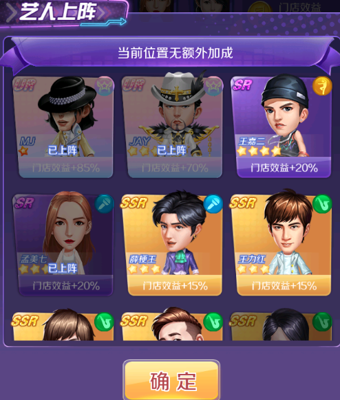门店宣传可以选择4个艺人作为宣传艺人,艺人品质越高,门店的效益加成就越高