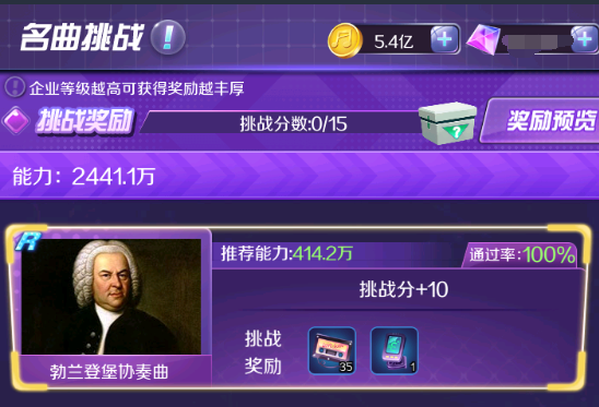 1.每个要挑战的名曲上面都有写明推荐的能力和挑战成功获取的奖励