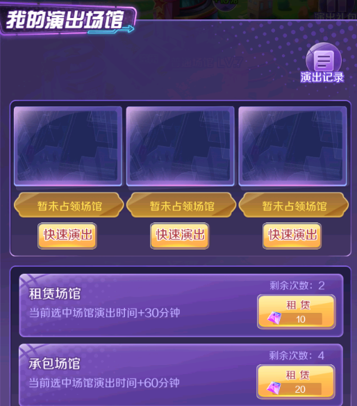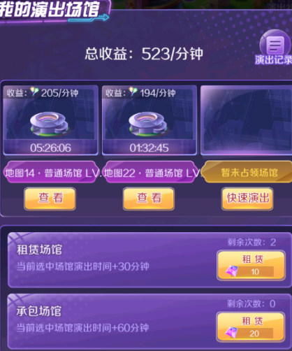 选择点击我的演出就可以看到自己占领的场馆,可以选择花费钻石,让自己能够在场馆里面更长时间,获取更多收益哦