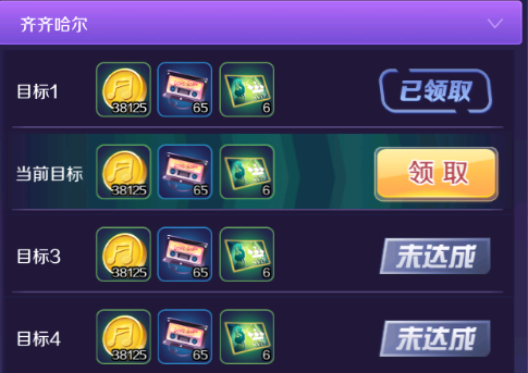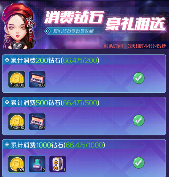 累计消耗钻石,达到要求,就可以领取到这个档位的奖励,奖励里面包含音乐币