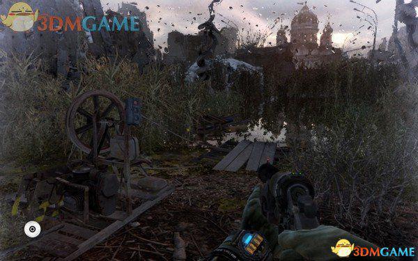 从箱子里拿取防毒面具和过滤器,戴上之后跟随帕维尔到地表,耀眼的阳光让安东适应了一会儿,才看清楚这座满目疮痍的城市。剧院就在广场的对面,一架坠毁的客机横在剧院前边。沿着倾斜的机翼跑下去,天空忽的下起了豪雨,跟着帕维尔走,先别进入废墟通道,而是往左边进到失事飞机的机舱里,拾取骷髅身上的过滤器,获得道德点(15)。