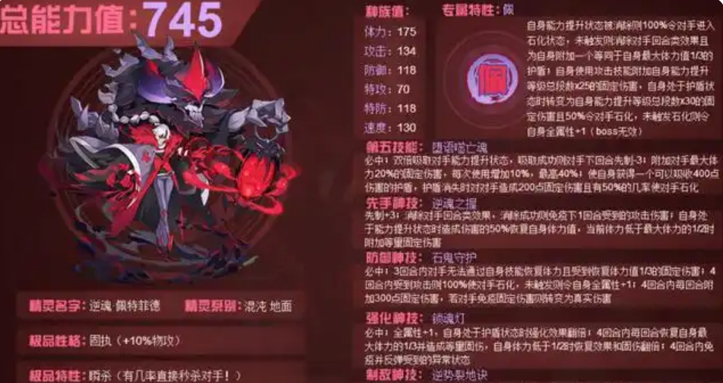 因为属性的克制作用,佩特菲尔德输出红色伤害的能力受到了很大的限制。从灵魂封印的角度来看,它显然以粉色伤害和控场为核心要素,不分种族。无论是数值特性还是属性倾向,都可以明显看出这是一只主打粉伤的精灵。当自身的强化状态被消除后,就会产生石化对手的效果。如果没有触发消灭对方回合的效果,则会附加自身体力1/3的护盾。