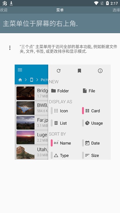 2。返回主接口,单击右上角的[三个点]图标以弹出菜单窗口,包括菜单功能,例如刷新,连接到存储,安装/弹出式,文件系统,自定义和显示设置。在这里,以[文件系统]为例