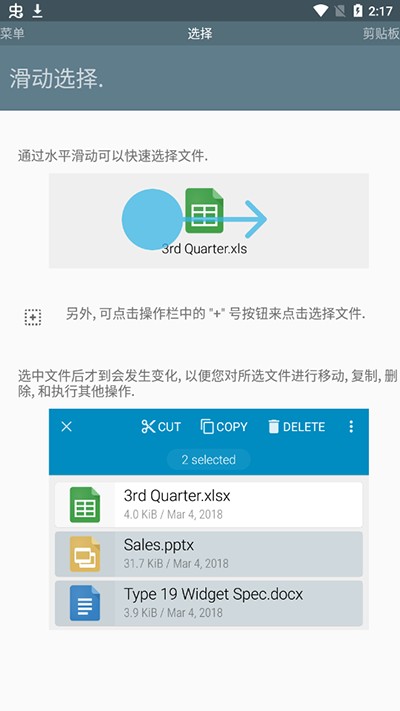 3。可以通过水平滑动和操作栏中的“+”符号执行文件选择;