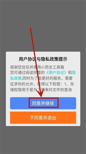 1.下载安装并打开小而全工具箱app,点击同意并继续,并同意隐私政策